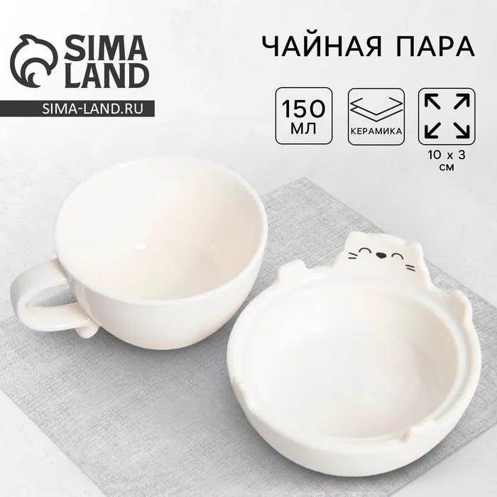 Кружка с блюдцем Дорого внимание «Белый кот», керамика, 150 мл, 10 х 3 см, белая — Характеристики