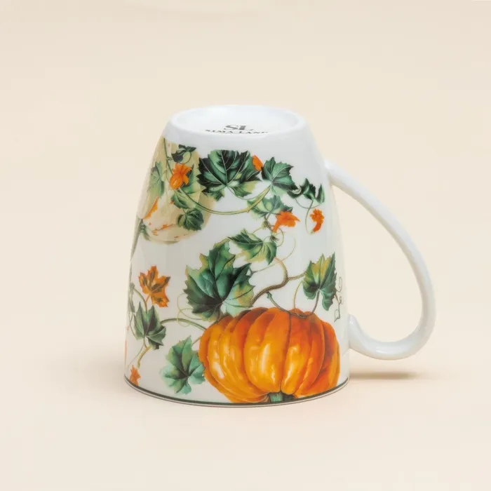 Изготовленная из качественного фарфора, эта кружка порадует вас ровным белым цветом и гладкой текстурой. Особенно привлекательным её делает оригинальный осенний рисунок с овощами, который привнесет праздничное настроение в любую осеннюю встречу.