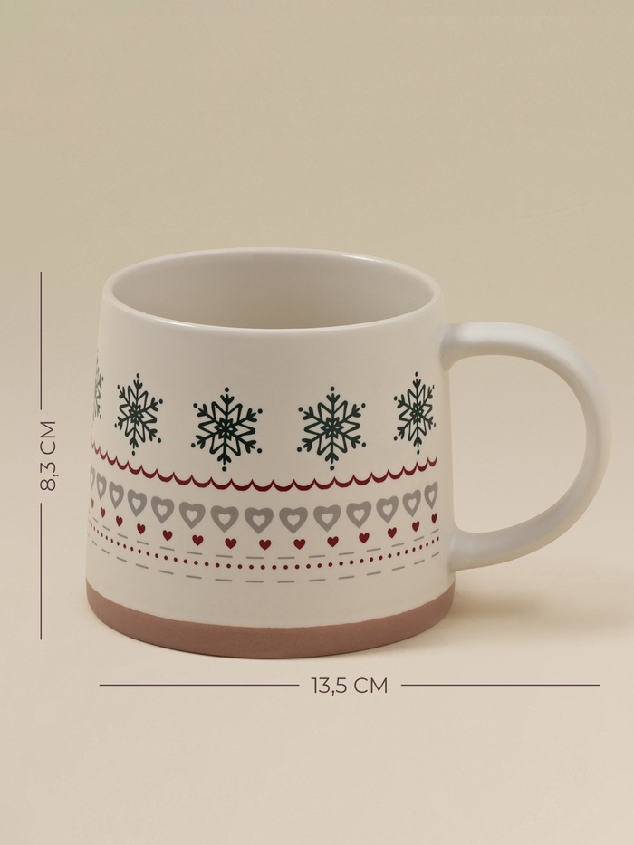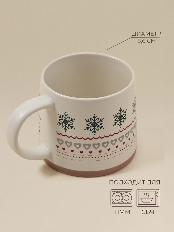 Ценители сдержанного декора оценят сочетание бежевого фона с лаконичным изображением снежинок. Практичные пользователи найдут увеличенный объём удобным для утренних кофейных ритуалов. Те, кто предпочитает матовые поверхности, отметят тактильную приятность материала.