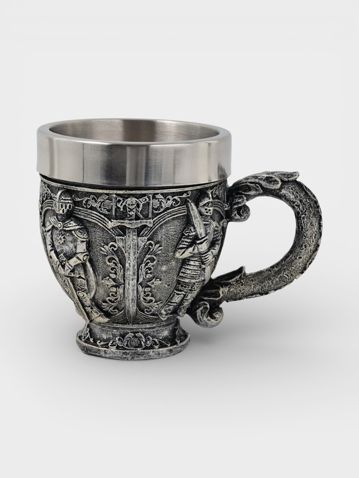 Серебристая средневековая кружка с рыцарским рельефом — не просто посуда, а атмосферный акцент для ценителей готики и исторических мотивов. Её объём в 300 мл подойдёт для утреннего кофе, травяного чая или тёплого глинтвейна после прогулки. Материал сочетает прочность нержавеющей стали и декоративность полистоуна, а выдавленный рисунок добавляет тактильную глубину без потери лаконичности формы.