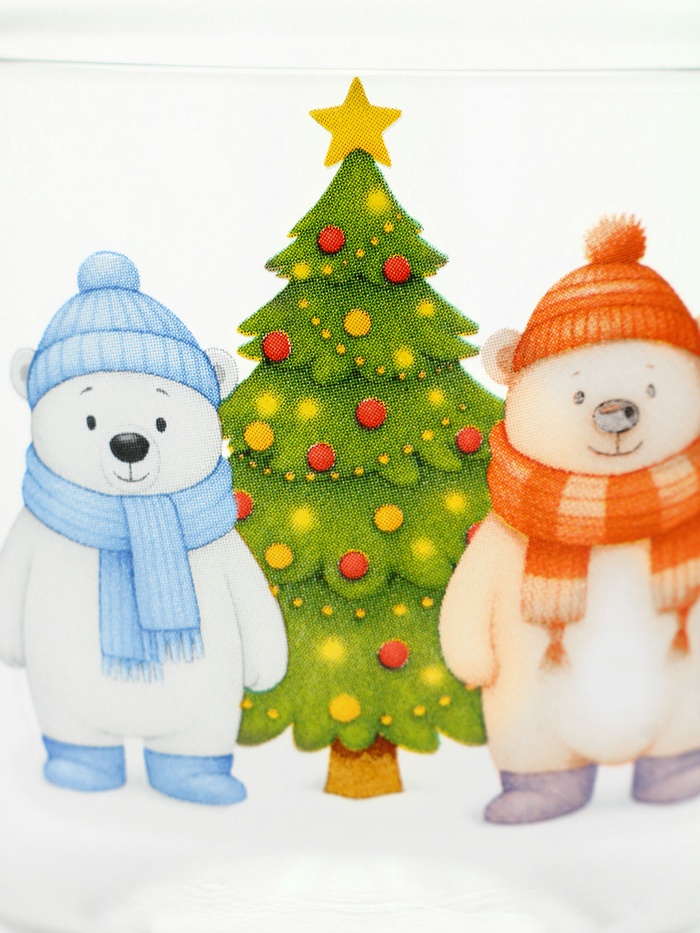 Кружка «Мишки в лесу» — это зимний лес, умещённый в прозрачное стекло. На фоне чистой поверхности — два мишки у ёлки: живые, чуть неуклюжие, с мягкими контурами и тёплыми тенями. Никаких надписей, никаких дат. Только сцена — тихая, как первый снег, и такая же настоящая.