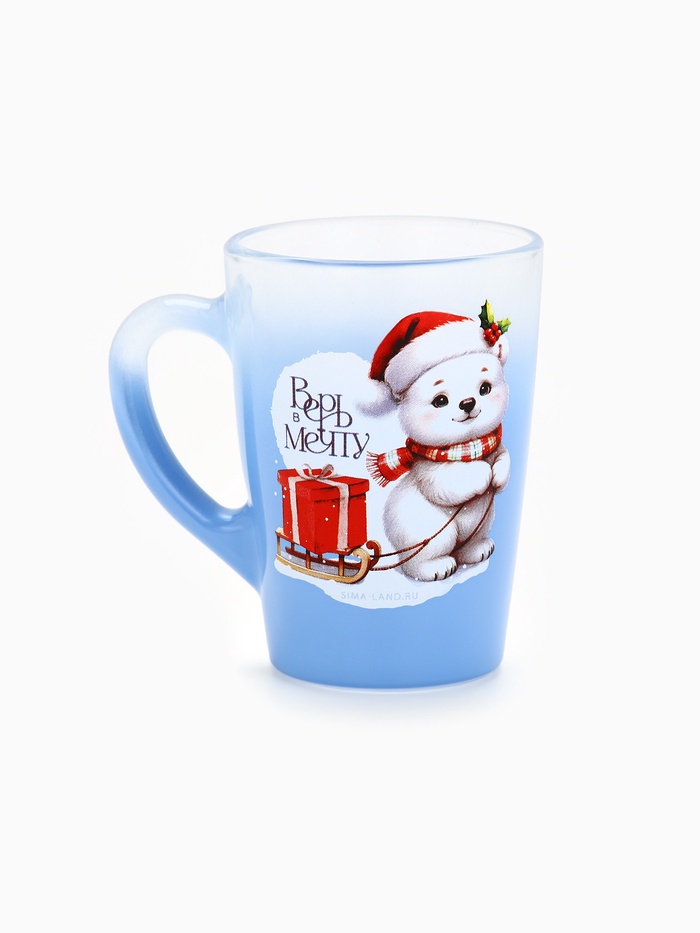 Кружка «Верь в мечту» — это зимнее утро, запечатлённое в стекле. Прозрачное основание, как чистое окно, и нежный голубой градиент — от лёгкого тумана у края до прозрачного света внизу. На поверхности — белый мишка, везущий на санках небольшой подарок: не громкий символ года, а тихий герой из детского сна. Надпись «Верь в мечту» не призывает — она *напоминает*, как шёпот взрослого, когда ребёнок впервые сам гасит ёлку: ”Она всё ещё горит внутри”.