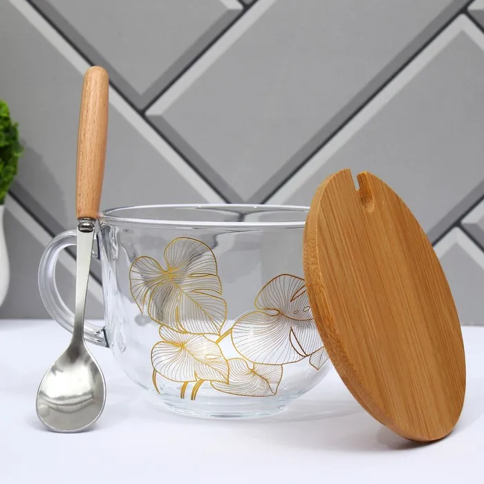 Кружка стеклянная с крышкой и ложкой Дорого внимание «Листья», 400 мл — Характеристики