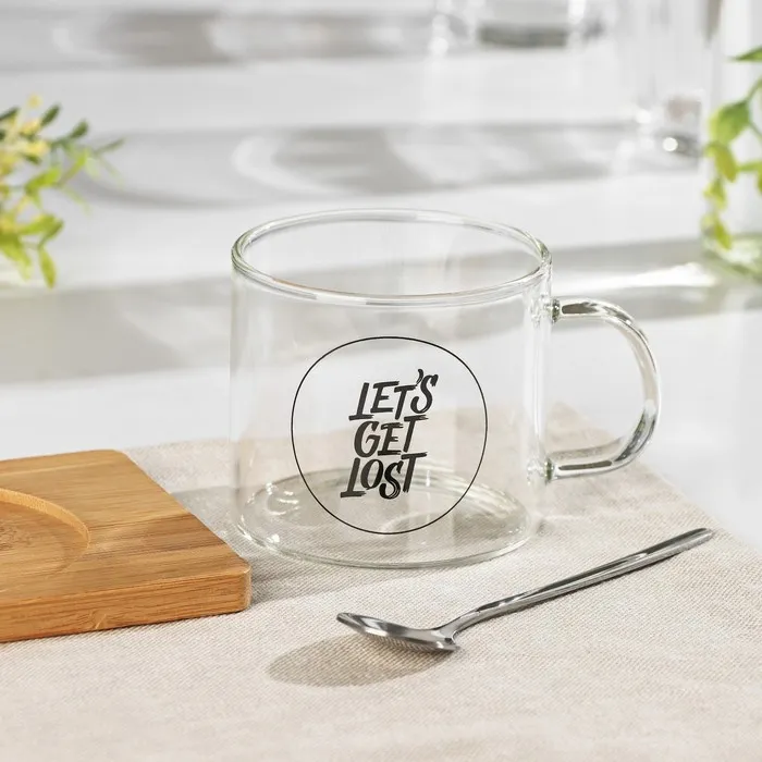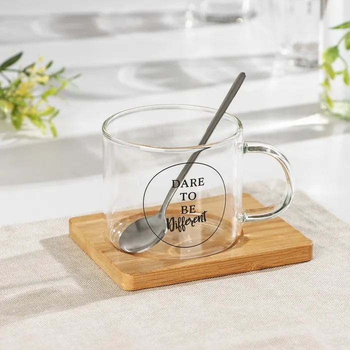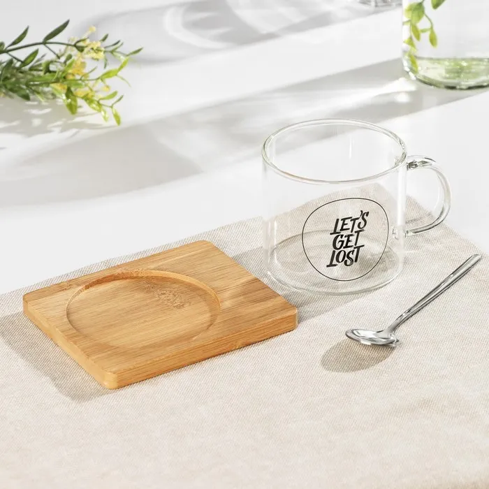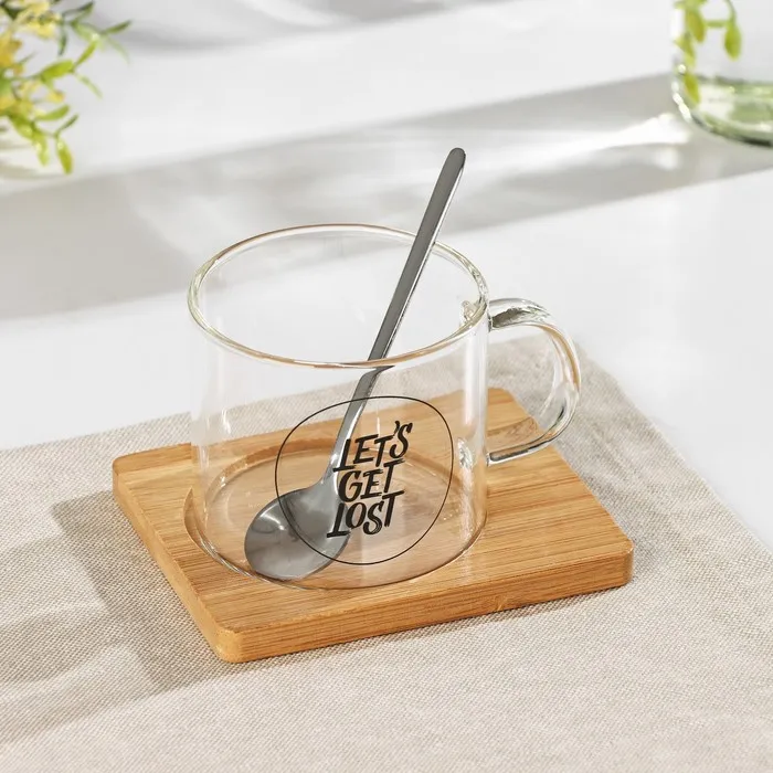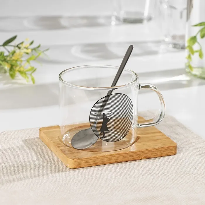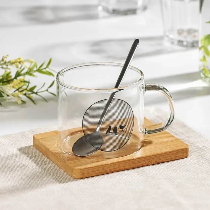 Кружка стеклянная с ложкой на деревянной подставке «Котик», 300 мл, рисунок МИКС — Характеристики