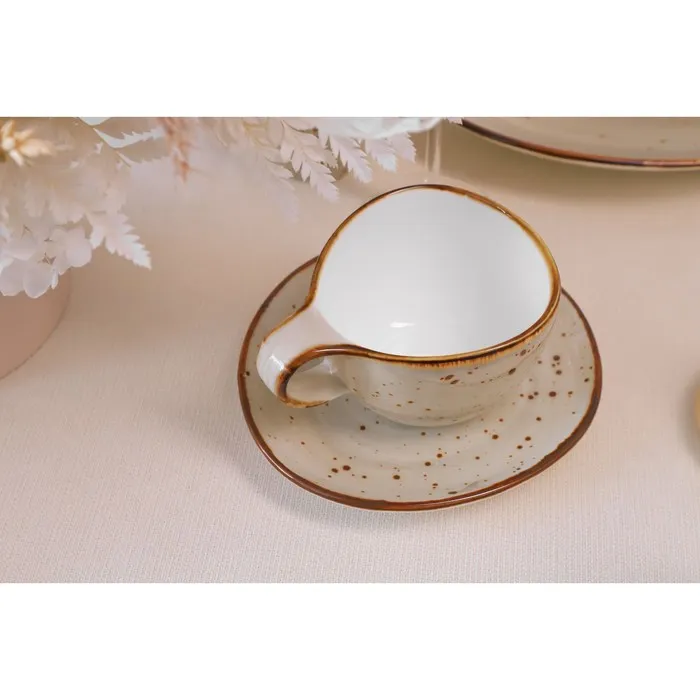 Фарфор этой коллекции отличается неповторимым цветом: нежный бежевый в крапинку. Такое цветовое решение делает каждую тарелку, кружку, блюдце или салатник настоящим произведением искусства.