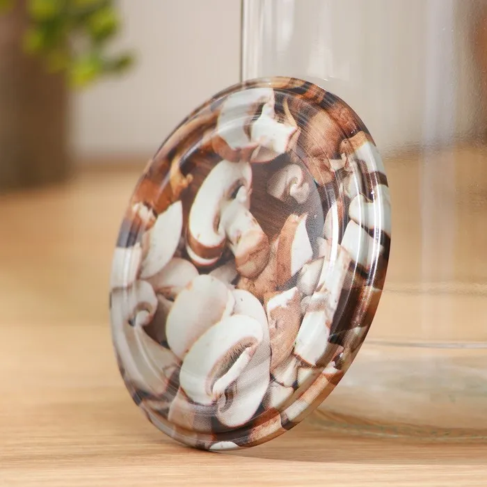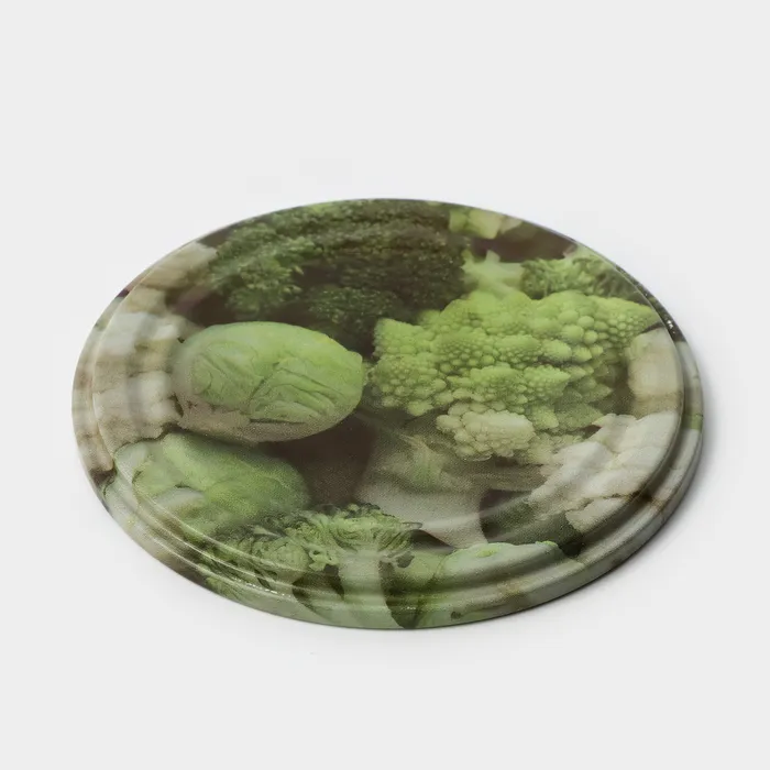 Крышка СКО1-82, литографированная (каждая крышка в столбике с литографическим изображением овощей, фруктов, ягод, грибов), изготовлена из белой жести и покрыта пищевым лаком. По внутреннему ободку крышки проходит резиновое пищевое уплотнительное кольцо для герметичного закрывания банки. Крышка полностью соответствует требованиям ГОСТ Р 51214-98 П.4.1., сертифицирована, прошла все необходимые санитарно-эпидемиологические исследования.