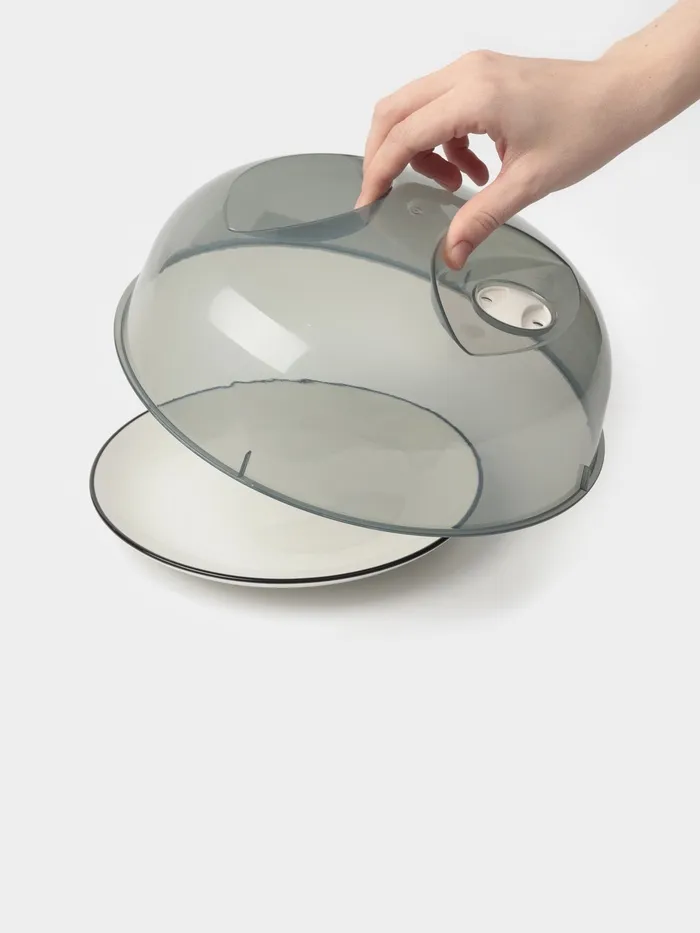Крышка с клапаном для выпуска пара предохраняет внутреннюю поверхность микроволновой печи от загрязнения в процессе разогревания или приготовления пищи (с открытым клапаном). Клапан для выпуска пара имеет два положения: открыт/закрыт. Имеется удобная ручка для удержания крышки. Можно использовать в холодильнике, как крышку для торта, сыра и т.п. Не впитывает запахи, можно мыть в посудомоечной машине.