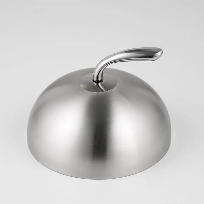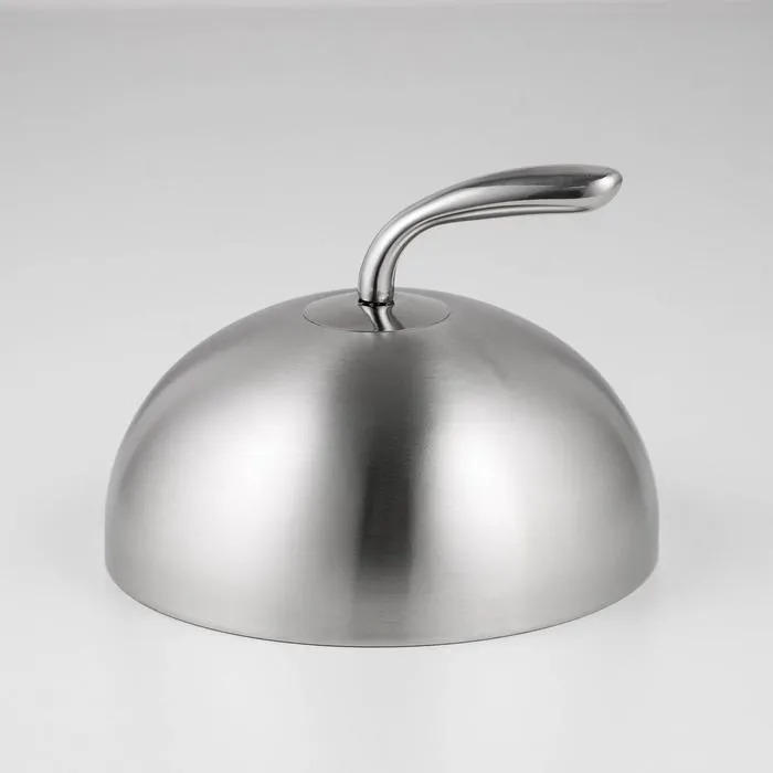 Круглая крышка-клош диаметром 20 см поможет красиво сервировать горячие закуски на праздничном столе, защитить готовое блюдо от заветривания и сохранить желаемую температуру. Изделие выполнено из нержавеющей стали. Такой материал максимально гигиеничен и не впитывает запахи, устойчив к механическим повреждениям.
