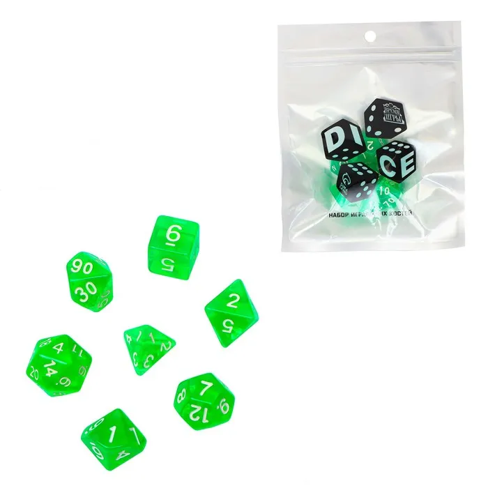 Набор зелёных дайсов для настольных игр — удобный комплект для поклонников DnD, ролевых кампаний и коллекционеров аксессуаров для tabletop игр. Каждый элемент выполнен из прозрачного акрила, что придаёт игровому процессу особую атмосферу и подчеркивает стиль вашего игрового пространства.