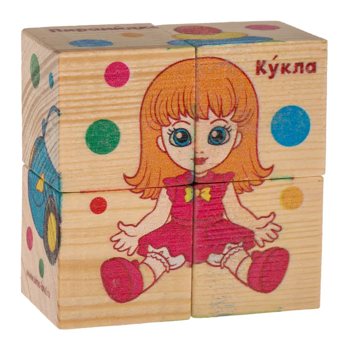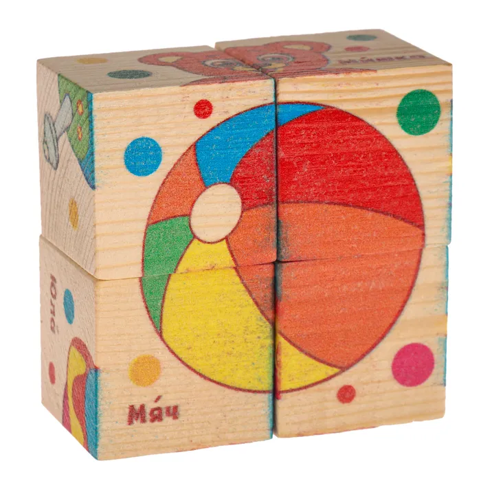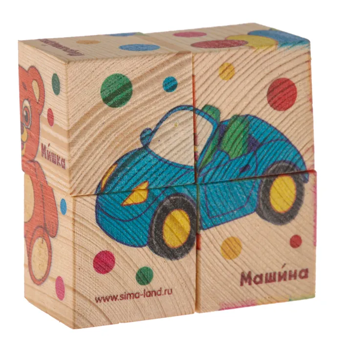 Детки полюбят деревянные кубики за яркость, приятные тактильные ощущения и возможность собрать 6 разных картинок. Предложите крохе разгадать загадку, связанную с изображениями на кубиках. Кроме того, они позволят познакомить малыша с геометрическими фигурами, цифрами, буквами, животными и транспортом.