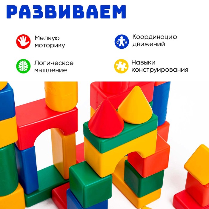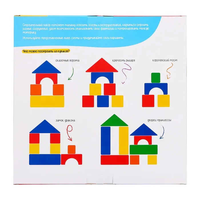 Красочный строительный набор разовьёт у крохи мелкую моторику, координацию движений, воображение, логическое и образное мышление, навыки конструирования. Из ярких частей малыш построит множество вариаций, с каждым новым разом совершенствуя свою фантазию.