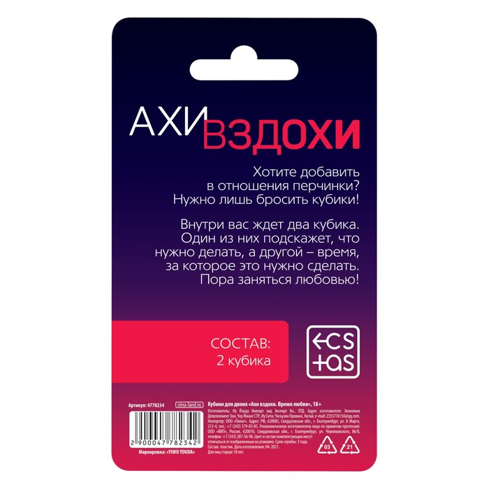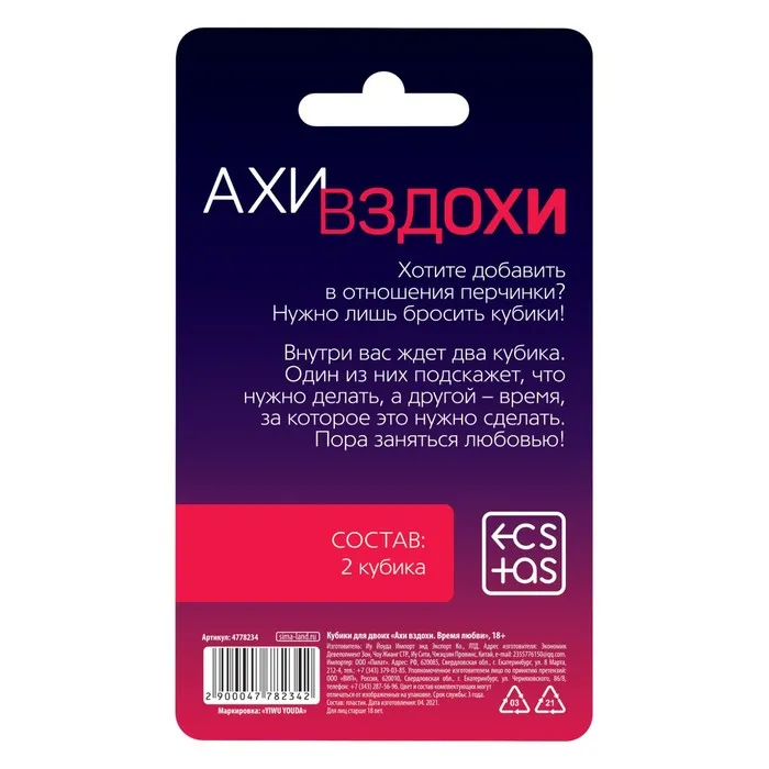 Кубики для пар «Ахи-вздохи. Время любви», 2 неоновых кубика, 18+ — Характеристики