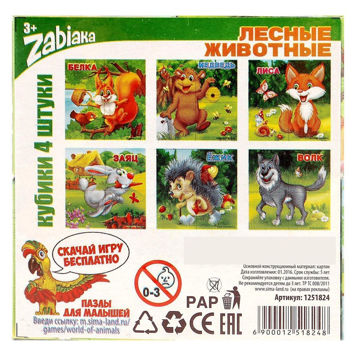На каждой грани фигуры вы найдёте часть красочной иллюстрации с одним из лесных животных. Из кубиков можно сложить шесть картинок с разными зверятами! Здесь есть и весёлая белочка, и добрый медвежонок, и другие животные.