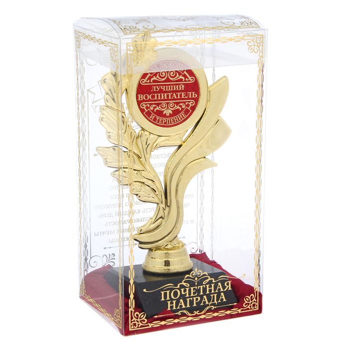 Кубок «Лучший воспитатель», наградная фигура, золото, 17,5 х 9 х 6,3 см, пластик станет самым лучшим подарком! Эта награда для самых замечательных людей, её нежные лавровые ветки передают всю глубину и теплоту ваших чувств! Он выполнен из пластика, покрыт золотой краской, дополнен яркой цветной бляшкой, из бумаги с голографией. Прозрачная пластиковая коробка с тиснением прекрасно дополняет кубок, а с обратной стороны вы найдёте тёплые слова и пожелания для вашего адресата.