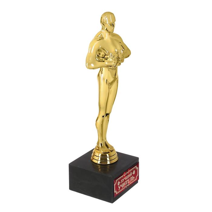 Золотистая фигура «Оскар» с лавровым венком в руках дополнена пластиковой подставкой. На постаменте есть яркий голографический шильд со званием получателя награды.