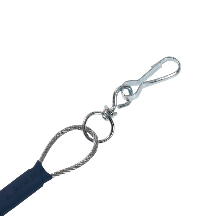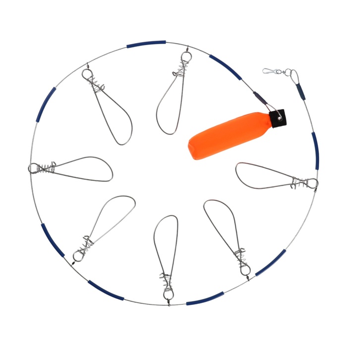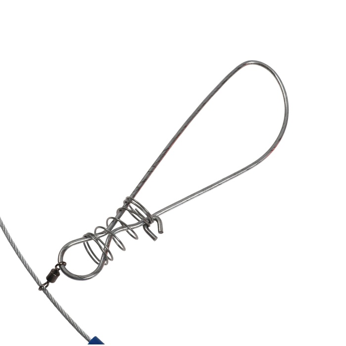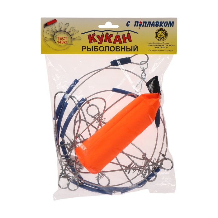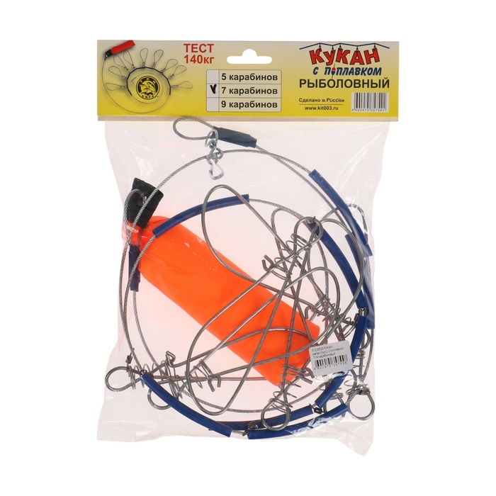 Средство для хранения рыбы в естественной среды в течении рыбалки. Кукан металлический сделан из троса с петлей на конце, в которую продет карабин. Крепление петли заизолированно. Трос имеет анти-коррозионное покрытие. Девять карабинов расположены через равное расстояние и не сбиваются, не съезжаются друг с другом.