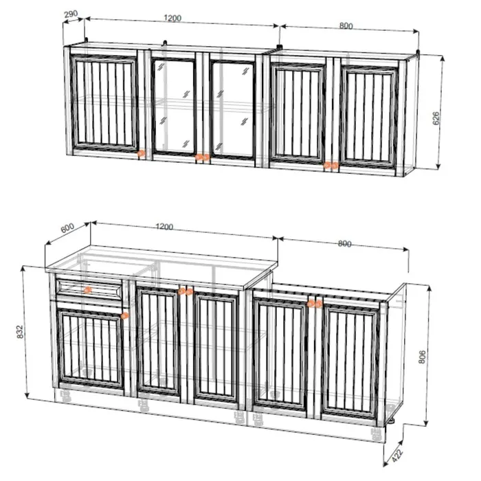 - Размеры и компоненты: Кухня имеет стандартные габариты 2000х600 мм, что обеспечивает оптимальное использование пространства. В её состав входят различные модули и элементы, такие как верхние и нижние шкафы, ящики, столешница и другие компоненты, которые обеспечивают максимальную функциональность.