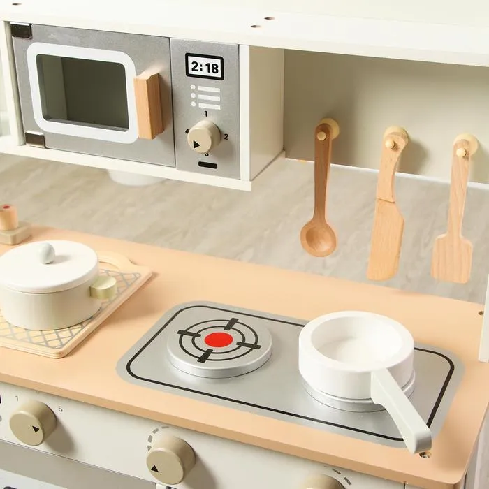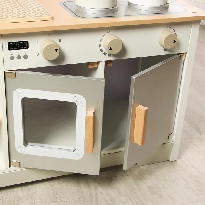 Предметы из комплекта сделаны из экологичного материала — дерева — и покрыты безопасной краской. В гарнитур встроена мойка для посуды. Духовку можно открывать и ставить внутрь пироги или другие блюда.