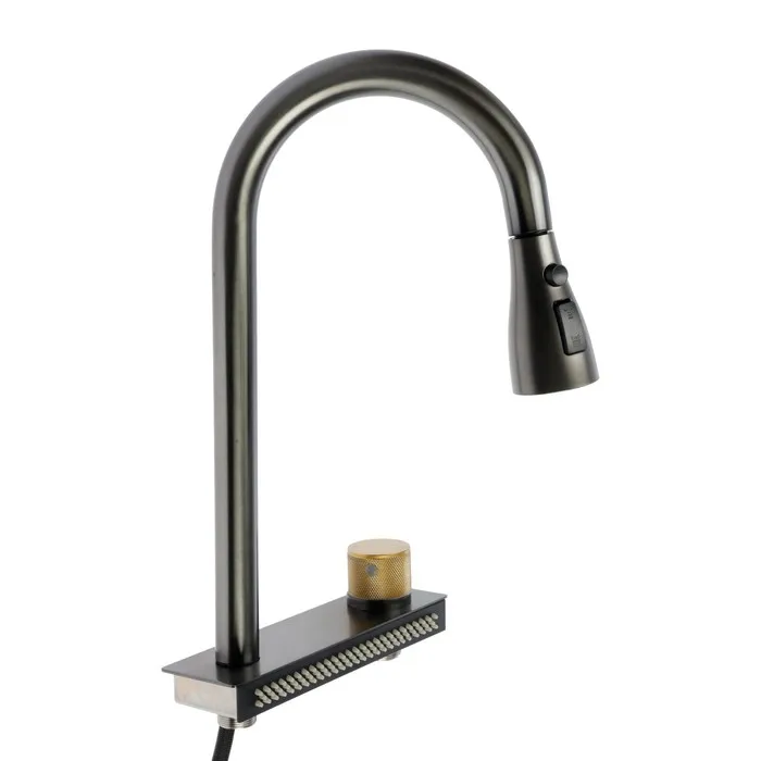 • Смеситель со встроенным выдвижным шлангом и несколькими режимами подачи воды;