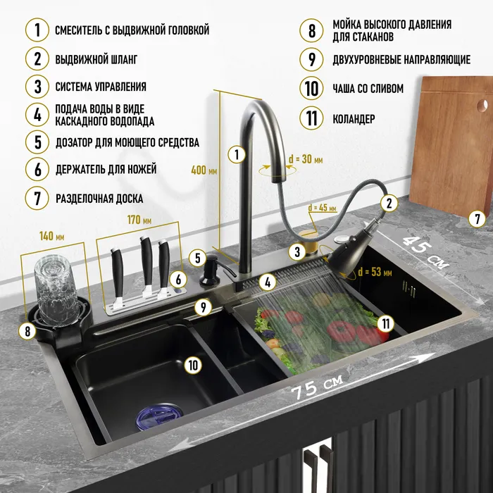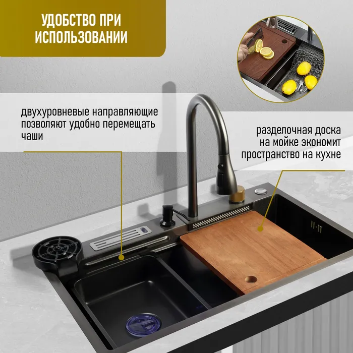 Кухонная мойка ZEIN M02, S=3.0 и 0.7 мм, смеситель, корзины, разделочная доска, сифон, графит — Характеристики