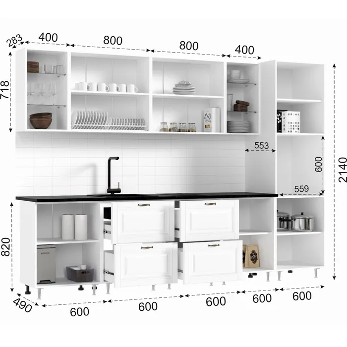 Кухонная мойка, решётка для посудосушителя, цоколь и подсветка – в комплект не входят!