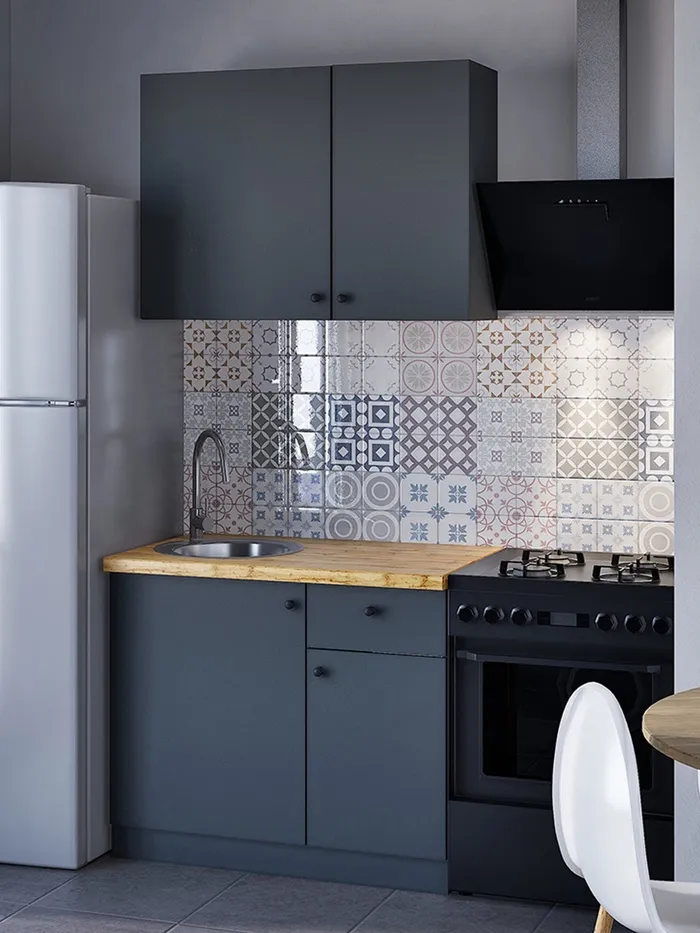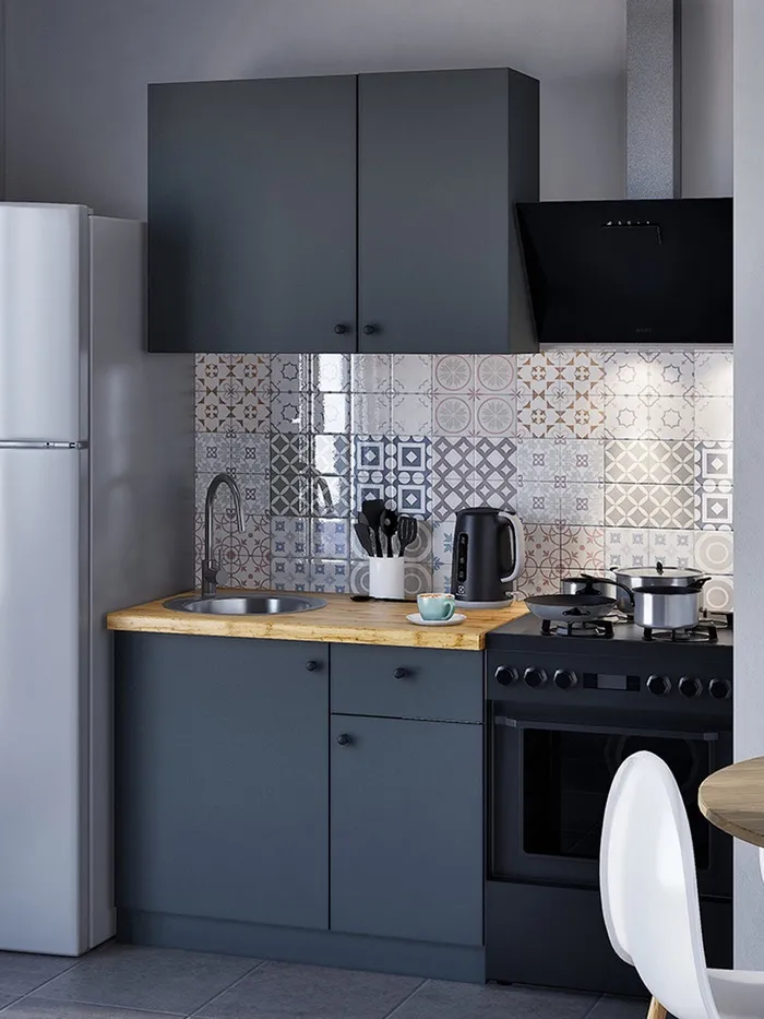 - Современный дизайн: цвет фасада графит и столешница в оттенке дуба вотан создают стильный и современный вид, идеально подходящий для небольших кухонь.