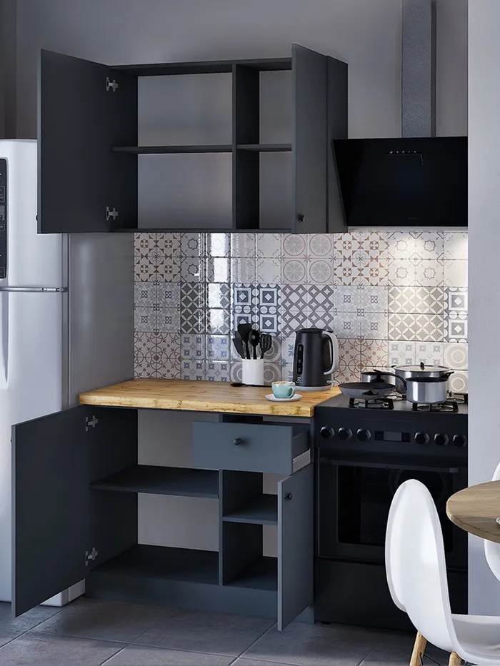 Решение для тех, кто хочет максимально эффективно использовать пространство без ущерба для стиля и функциональности. С фасадом цвета графит, столешницей в оттенке дуба вотан и современным дизайном, гарнитур станет центральным элементом вашей кухни.