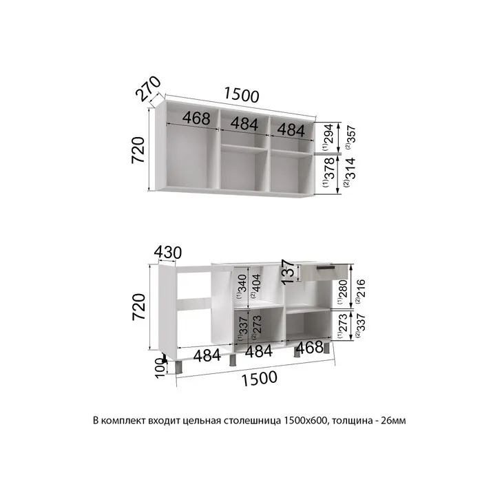 Кухонный гарнитур Марбл, 1500х600, Белый/Мрамор Лайт,Мрамор Дарк/Мраморный берег — Характеристики