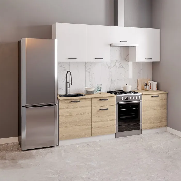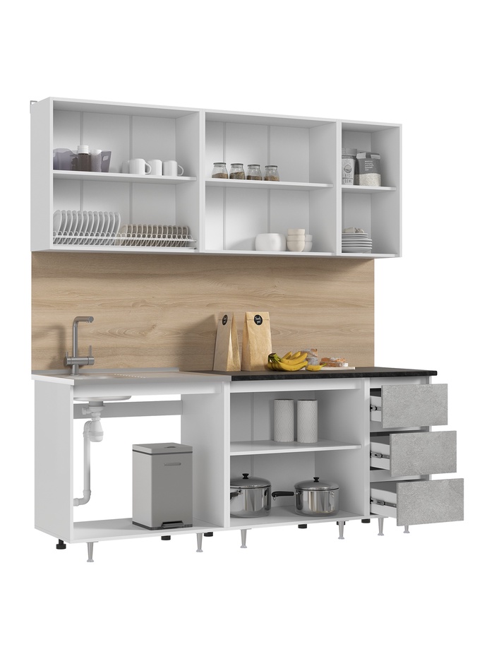 Набор мебели, предназначенный для обустройства кухни. Гарнитур обеспечивает утилитарность кухни, позволяя хранить продукты, посуду и кухонные принадлежности по местам, организует рабочее пространство для приготовления пищи. Поможет поддерживать порядок на кухне и делает процесс приготовления еды более комфортным и приятным.