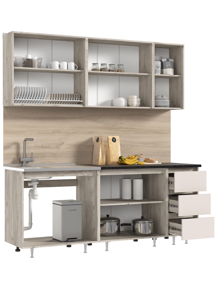 Набор мебели, предназначенный для обустройства кухни. Гарнитур обеспечивает утилитарность кухни, позволяя хранить продукты, посуду и кухонные принадлежности по местам, организует рабочее пространство для приготовления пищи. Поможет поддерживать порядок на кухне и делает процесс приготовления еды более комфортным и приятным.