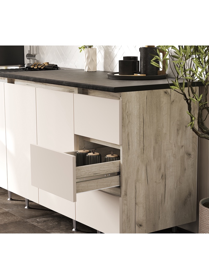• Выдвижные ящики: можно использовать специальные органайзеры и лотки для столовых приборов, что позволяет рационально использовать место и хранить приборы в порядке и чистоте. Шариковые направляющие обеспечивают полное и бесшумное открывание ящиков, облегчая ежедневное пользование.