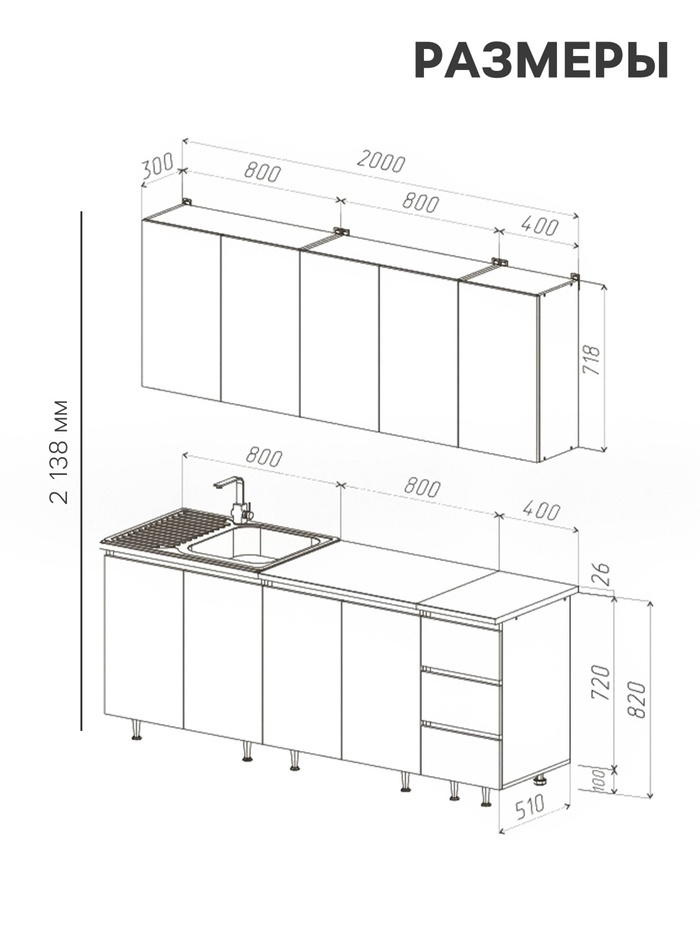 Кухонный гарнитур прямой «Челси», 2000 мм, цвет кашемир/крафт серый — Характеристики