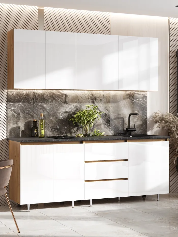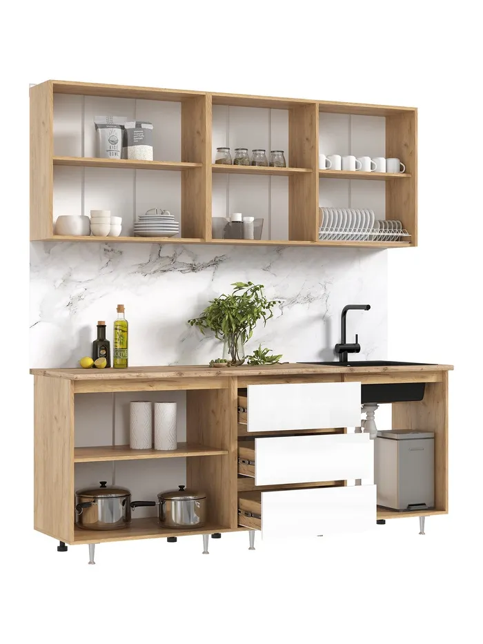 Набор мебели, предназначенный для обустройства кухни. Гарнитур обеспечивает утилитарность кухни, позволяя хранить продукты, посуду и кухонные принадлежности по местам, организует рабочее пространство для приготовления пищи. Поможет поддерживать порядок на кухне и делает процесс приготовления еды более комфортным и приятным.