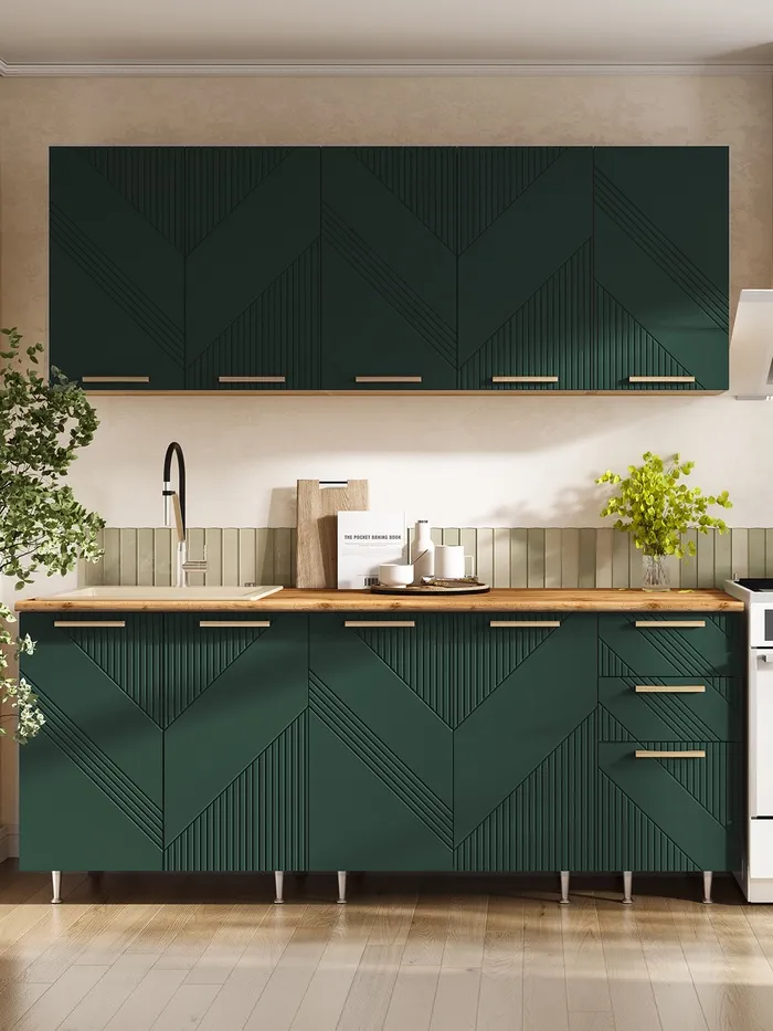 - Современный дизайн: тёмные зелёные фасады сочетаются с текстурой дуба крафт