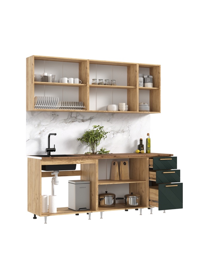 Современный и стильный кухонный гарнитур «Ирис» сочетает в себе лаконичный дизайн с продуманной функциональностью. Контрастное сочетание тёмных фасадов зелёного цвета и корпуса цвета дуб крафт создаёт элегантный и уютный акцент для любой кухни.
