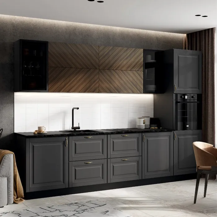 Кухонный гарнитур 3000 Престиж - это современное и функциональное решение для вашего дома. Кухонный гарнитур 3000 Престиж сочетает в себе удобство и практичность, обеспечивая комфорт и уют. Кухня выполнена в стильном цвете " Графит софт, Графит, прайм орех", который легко впишется в любой интерьер. Материал каркаса - ЛДСП, что гарантирует прочность и долговечность конструкции.