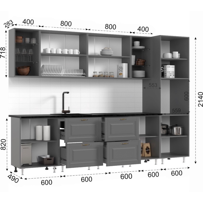 - Высота кухонного гарнитура - 2140 мм.