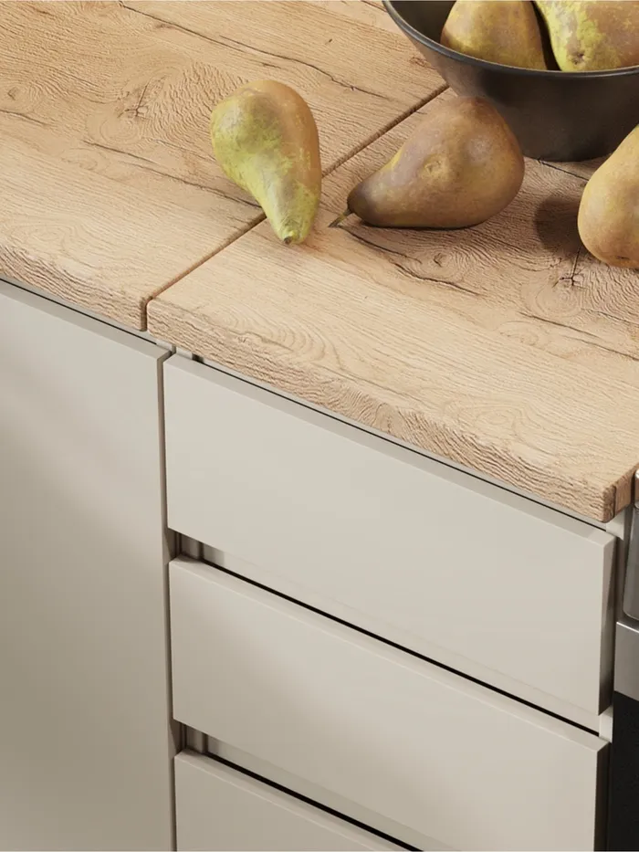 - Фасады: матовые фасады без декора и ручек. Дверцы и ящики открываются за счет специальных выемок для захвата.