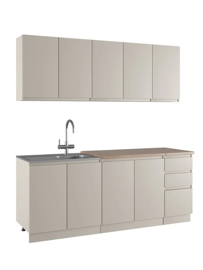 Готовое решение для современной кухни. Фасады в нежном цвете кашемир сочетаются с теплотой столешницей в оттенке дуб кера, создавая уютную атмосферу на кухне. Изготовлен из ЛДСП (ламинированная древесно-стружечная плита). Компактный размер 2000 мм идеально подходит для малогабаритных помещений.