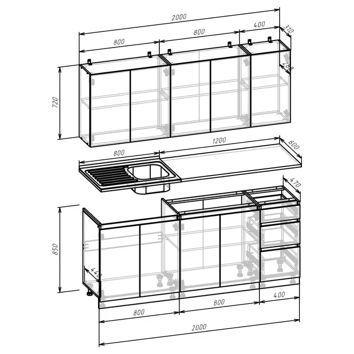 Кухонный гарнитур прямой «Зара», с столешницей, 2000×600 мм, цвет белый — Характеристики