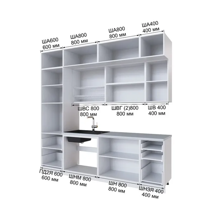 - Кухонная мойка, стеновая панель, решётка для посудосушителя, приобретаются отдельно.