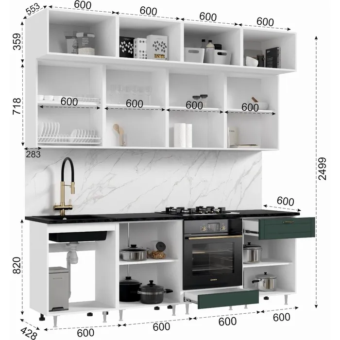 Кухонная мойка, решётка для посудосушителя, цоколь и подсветка – в комплект не входят!
