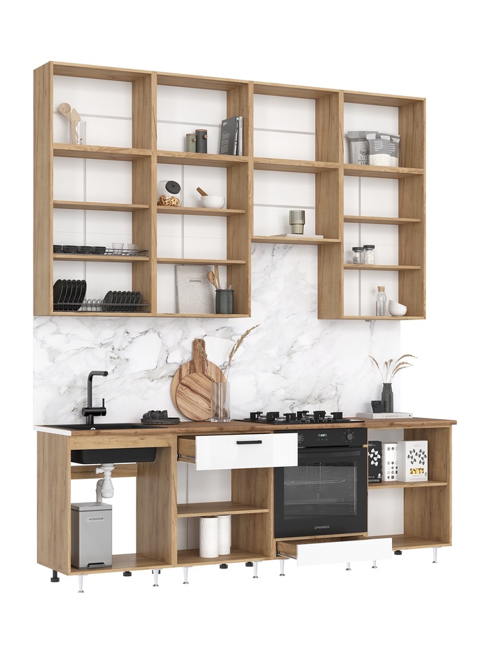 Наполнение представлено полками за распашными дверцами и выдвижными ящиками разного размера. Освобождает рабочую поверхность, предоставляя дополнительное место для хранения. Разнообразие мест для хранения позволяет эффективно организовать пространство и поддерживать порядок на кухне.