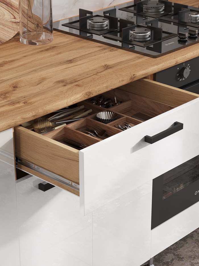 Можно использовать специальные органайзеры и лотки для столовых приборов, что позволяет рационально использовать место и хранить приборы в порядке и чистоте. Шариковые направляющие обеспечивают полное и бесшумное открывание ящиков, облегчая ежедневное пользование.