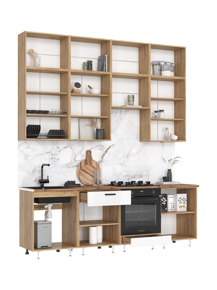 Наполнение представлено полками за распашными дверцами и выдвижными ящиками разного размера. Освобождает рабочую поверхность, предоставляя дополнительное место для хранения. Разнообразие мест для хранения позволяет эффективно организовать пространство и поддерживать порядок на кухне.