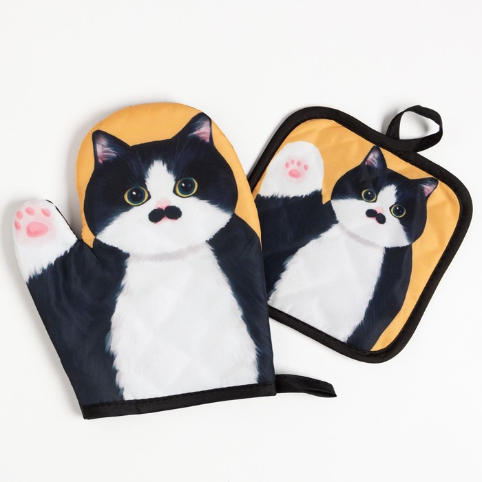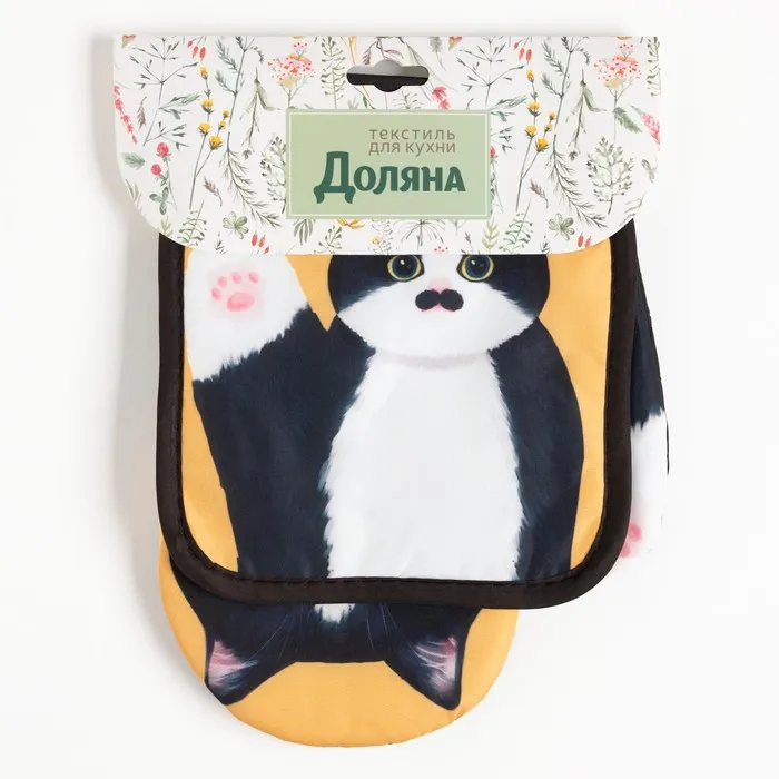 Кухонный набор «Доляна. Котики. Бориска»: прихватка 17×17 см, варежка 24×18 см, 100% п/э — Характеристики