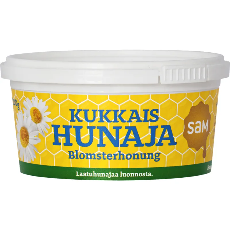 SAM-кukkaishunaja - это мягкий кристаллический многоквітковый мед. Это 100% натуральный продукт, созданный пчелами из цветочного нектара. Мед собран из таких растений, чтобы оставаться кристаллическим при комнатной температуре. Смесь меда из стран ЕС и за пределами ЕС. Не подходит для детей младше 1 года. Упаковка 200 г.
