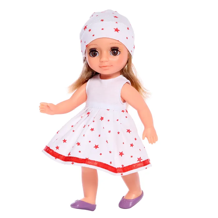 Кукла представлена в стильном летнем комплекте одежды. Она носит элегантное безрукавное платье, которое украшено отстроченной тесьмой по подолу. Комплект дополняют подходящие по цвету шапочка, носочки и туфельки.