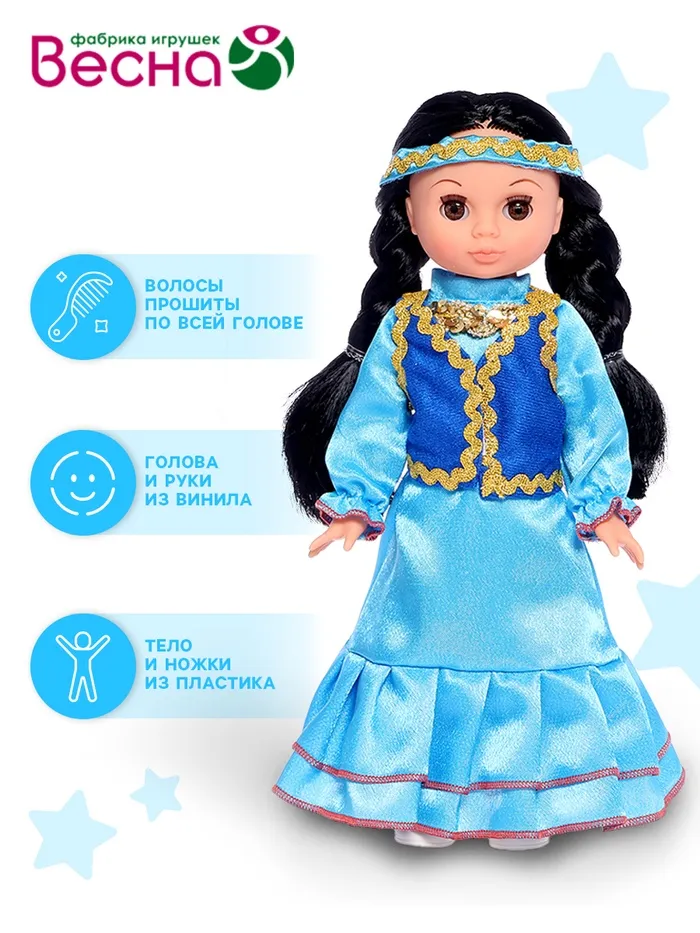 Кукла «Эля в башкирском костюме» разнообразит сюжетно-ролевую игру и познакомит ребёнка с национальными традициями Башкирии. С ней игры будут весёлыми и познавательными!