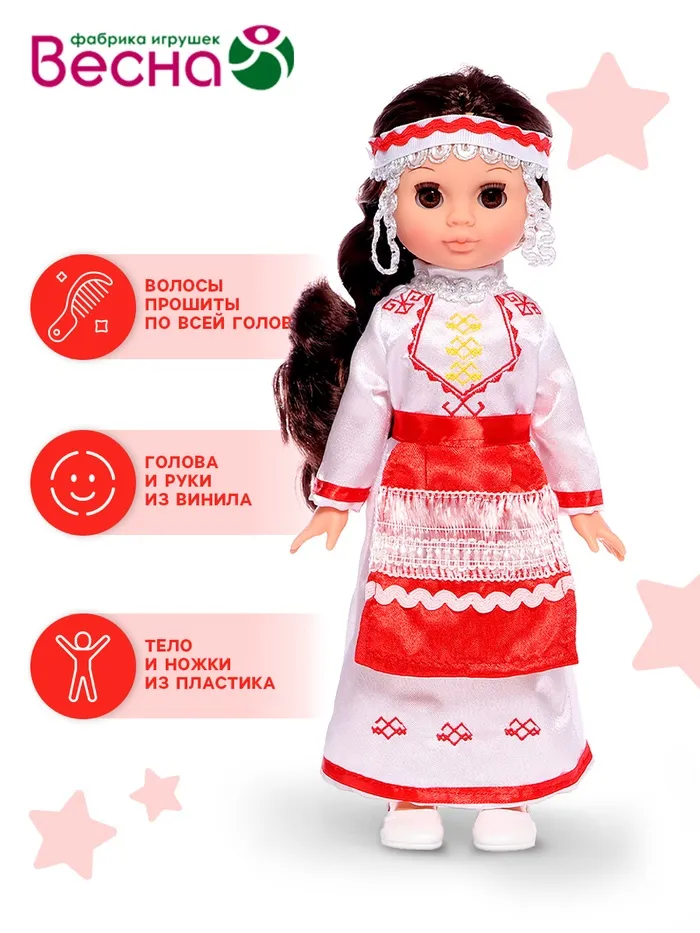 Кукла «Эля в чувашском костюме» разнообразит сюжетно-ролевую игру и познакомит ребёнка с национальными традициями Чувашии. С ней игры будут весёлыми и познавательными!